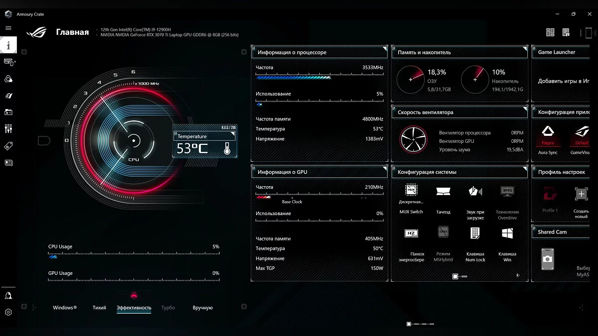 Бог стелса. Ноутбук смог удивить относительно низким уровнем шума от системы охлаждения. По субъективным ощущениям — это один из самых тихих ноутбуков ROG, которые побывали у нас на тестах. Особенно впечатляет, учитывая топовую начинку ноутбука. Также отметим полностью останавливающиеся вентиляторы при офисной работе в тихом режиме.