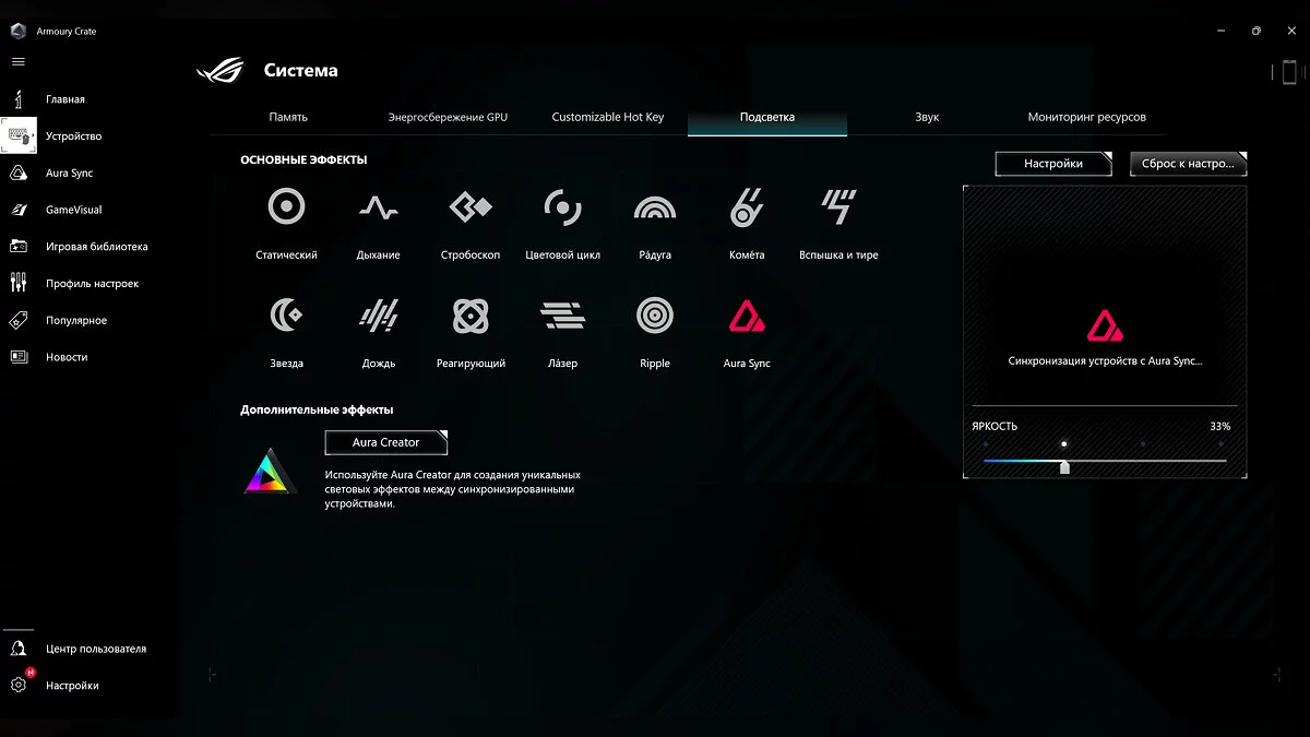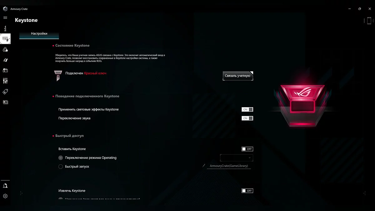 В верхнем ряду также расположены функциональные клавиши регулировки громкости, включения и отключения микрофона и вызова фирменного программного обеспечения Armoury Crate. Приложение получило новый дизайн, который, по субъективным ощущениям, стал удобнее.