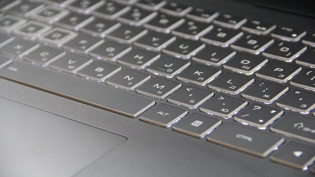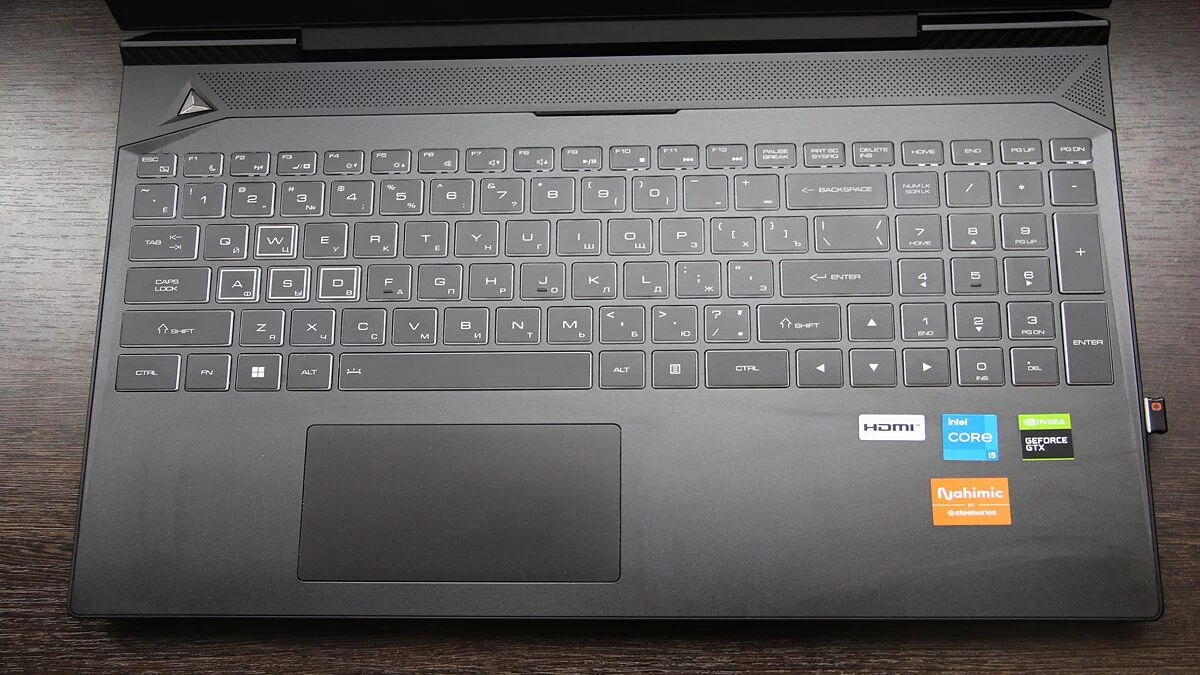 В клавиатуру встроены все стандартные вещи — большой тачпад размером 107×62 мм, цифровой блок, стрелки и ANSI-раскладка с длинной левой кнопкой Shift и одноуровневым Enter. Функциональные клавиши регулируют яркость, звук и управляют файлами мультимедиа, включают и выключают Wi-Fi и так далее — стандартный набор для любого лэптопа. Прочие игровые решения отсутствуют. Настроить можно только яркость диодов или полностью убрать подсветку клавиатуры. Зато все клавиши откликаются чётко на нажатия и не залипают.