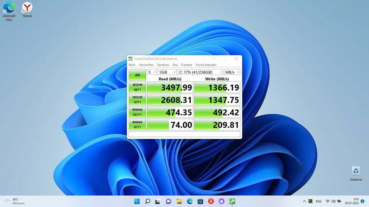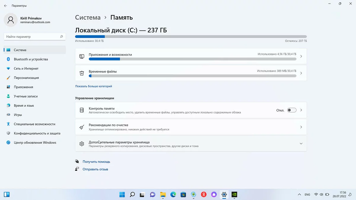 Накопитель — NVMe SSD Kimtigo MG981K объёмом 256 Гб. Фактическое место для нужд пользователя — 237 Гб.