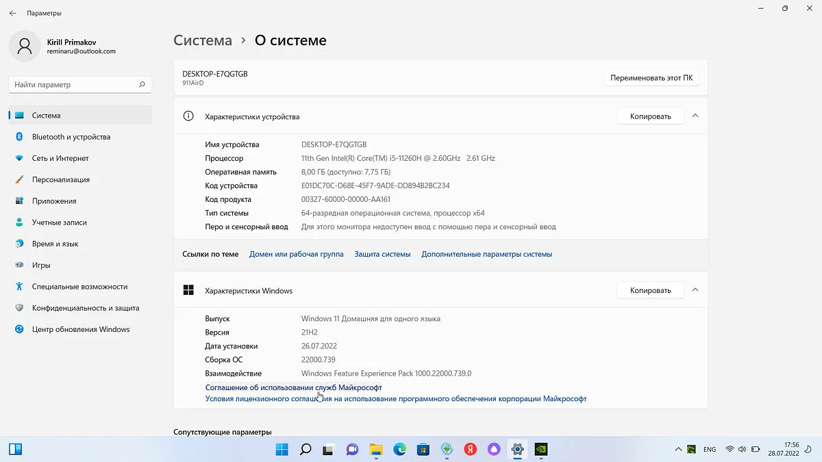 Ноутбук работает на базе процессора Intel Core i5-11260H с 6 ядрами и 12 потоками. Также установлены видеокарта NVIDIA GeForce GTX 1650 с 4 Гб GDDR6 без трассировки лучей, память 8 Гб DDR4 с частотой 3200 МГц, сетевой модуль Realtek RTL8168/8111 с Wi-Fi 5 и модуль Bluetooth 4.2.
