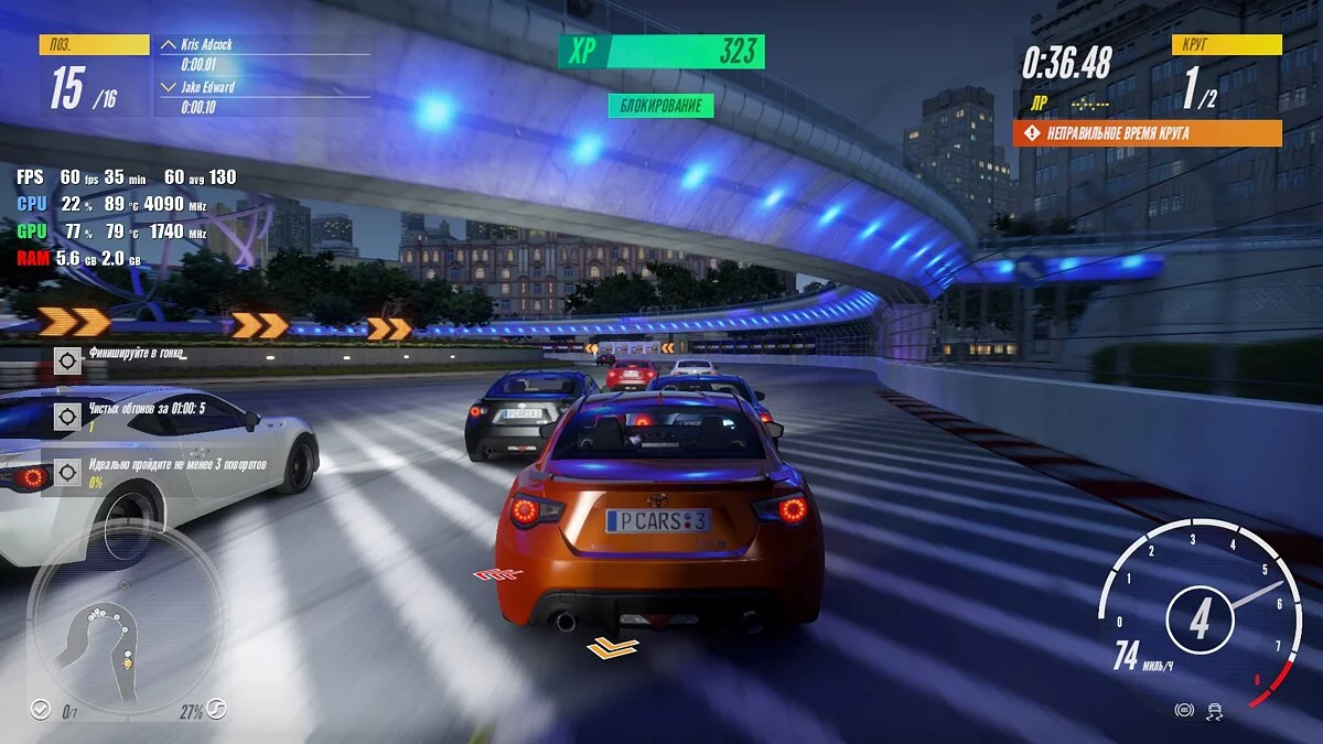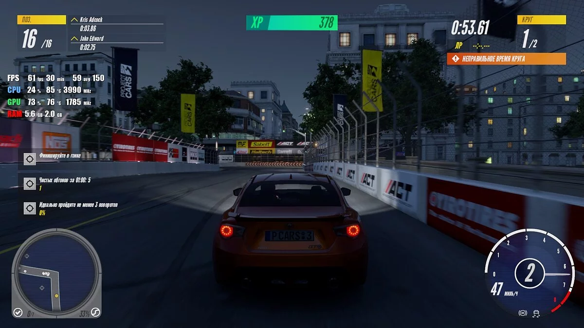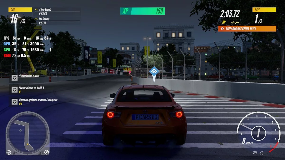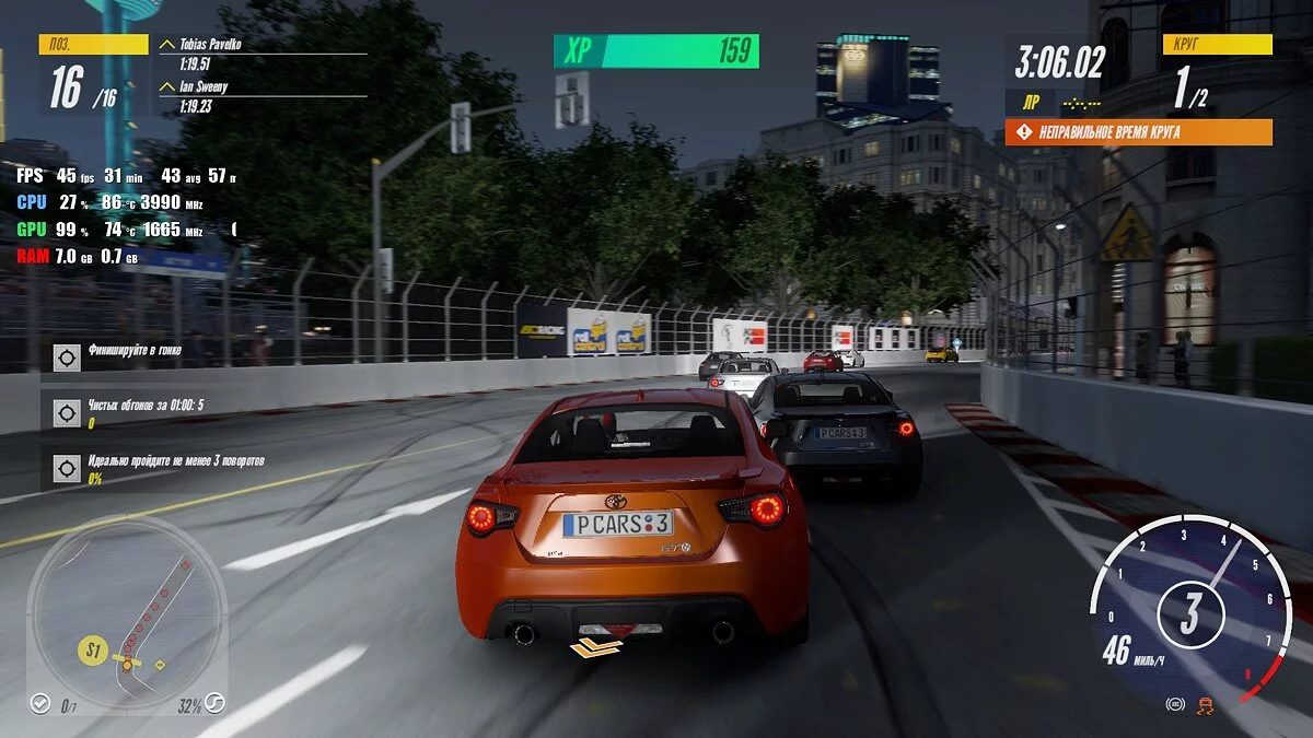 Project Cars 3. С максимальными настройками частота кадров находилась возле отметки в 45 FPS. Играть было комфортно.