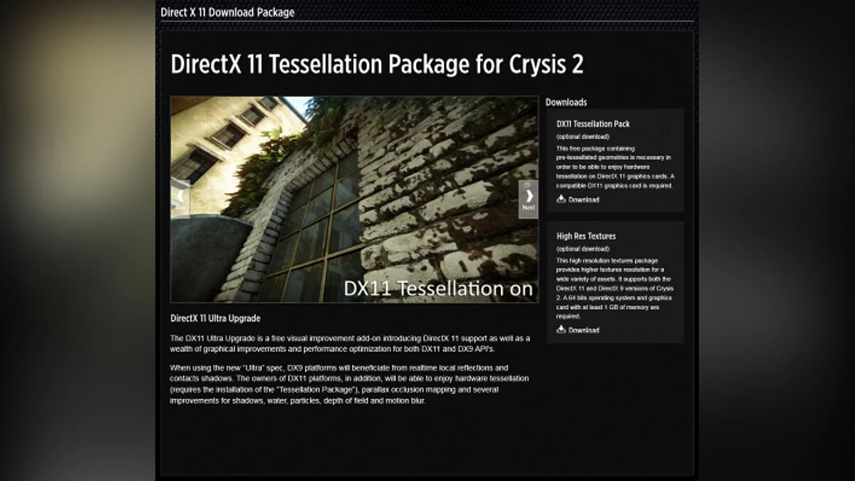 Crytek разместила на сайте MyCrysis сообщение о том, что Crysis 2 обзаведётся поддержкой DirectX 11, правда пост уже убрали с сайта почему-то.Обновление должно выйти под названием DirectX11 Ultra Upgrade и обеспечить геймеров улучшенной визуальной составляющей с поддержкой DirectX11, а также внести ряд графических и системных исправлений, благодаря которым увеличится производительность и оптимизация игры как при работе с DX11, так и с DX9.Для пользователей с DX9 выпустят также сборник текстур высокого разрешения.Хотя пост и был удалён, скриншот странички удалось сохранить.