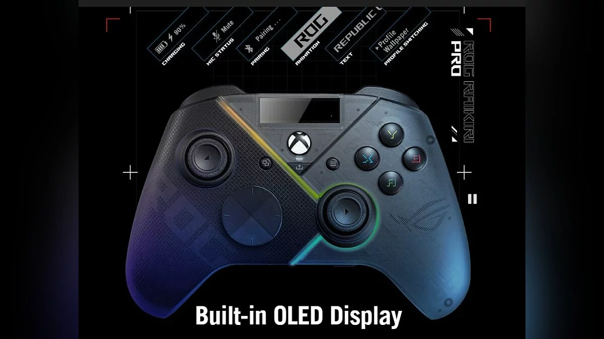 ASUS и Xbox представили новый геймпад для консолей, который оснащён встроенным OLED-дисплеем и дополнительными кнопками. Как отмечается, экран можно настраивать под себя. Например, на него получится вывести индикаторы заряда батареи, гарнитуры и других устройств. Или же просто можно транслировать пользовательские изображения и анимации.