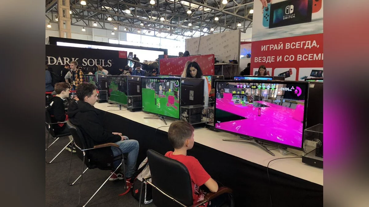 Огромное количество консолей с разными играми на них, начиная от забавной Mario + Rabbids Kingdom Battle и заканчивая хардкорной Dark Souls. У каждого стенда ожидали сотрудники, которые были готовы помочь каждому посетителю. Также был магазинчик с фирменными продуктами компании, где можно было купить понравившиеся игры. Все было сделано на высшем уровне.