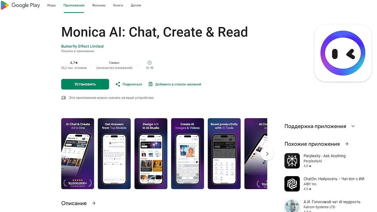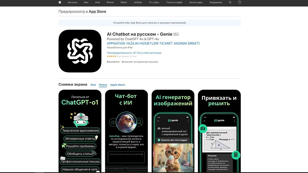 Ещё один ИИ-помощник, но на этот раз для iPhone. Бесплатный и поддерживает русский язык. Работает на моделях GPT-4 и GPT-3, специализируется на сборе информации, беседах, генерации изображений и решении несложных задач.
