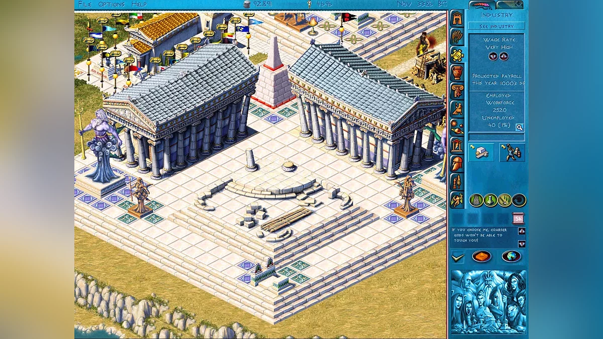 Один из самых обаятельных классических градостроительных симуляторов — лёгкий по настроению, полный мифов и тонкого юмора, и при этом удивительно актуальный даже спустя два десятилетия. В отличие от строгого Caesar или монументального Pharaoh, атмосфера здесь мягче: боги могут появиться прямо на улицах, чтобы благословить или наказать город, а герои отражают атаки мифических чудовищ за городской стеной.