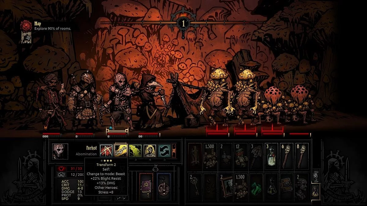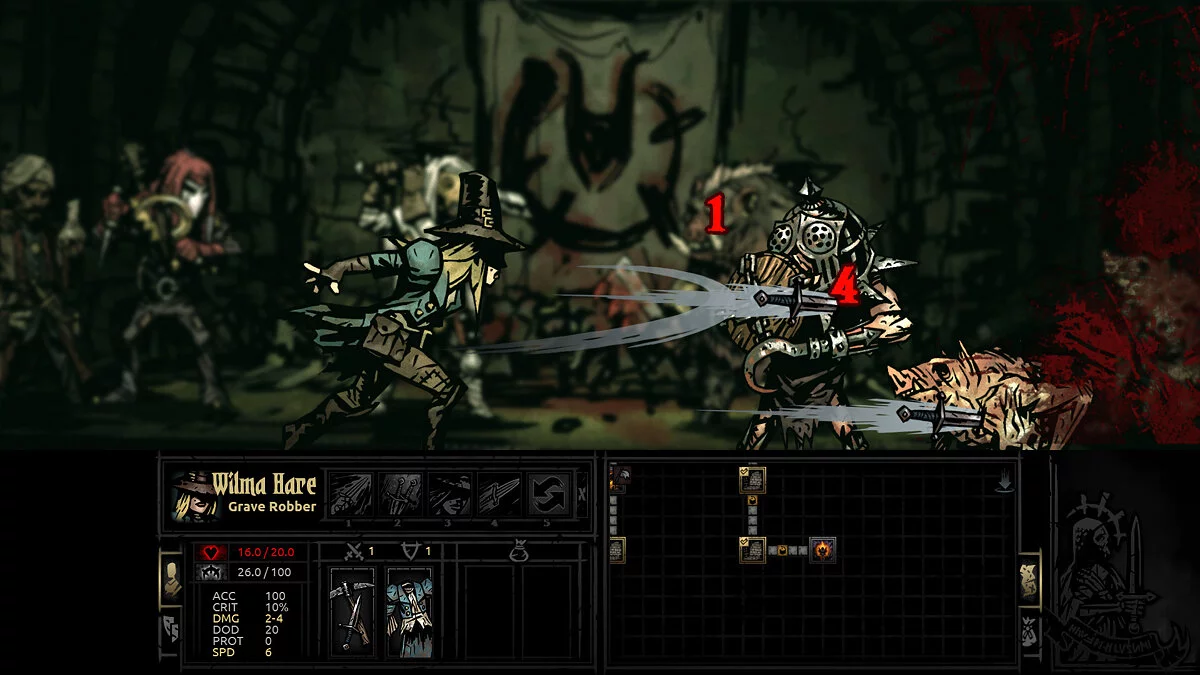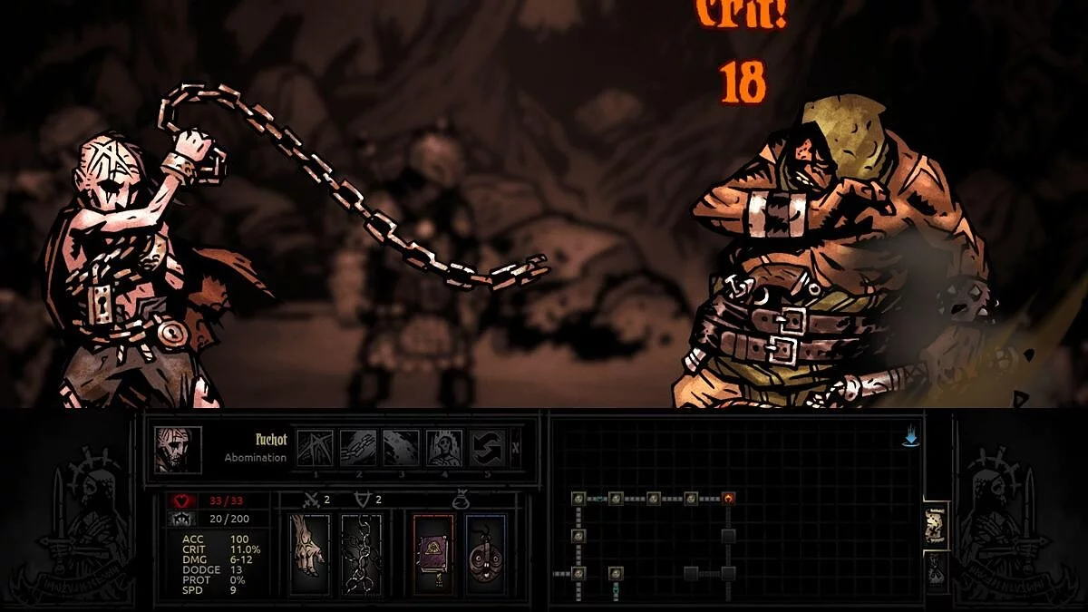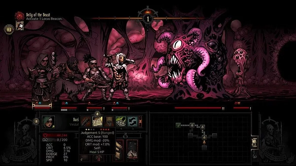 Darkest Dungeon — очень хардкорная игра. Геймеру нужно постоянно следить не только за уровнем здоровья персонажей, но и за их психическим состоянием. Каждый герой уникален и обладает способностями. В ходе изучения подземелий они всегда подвержены стрессу, который пагубно сказывается на их эмоциональном восприятии приключения. Боевая система выполнена в 2D-стилистике. Помимо правильного подбора героев и способностей, игрок должен учитывать положение персонажей на поле боя.