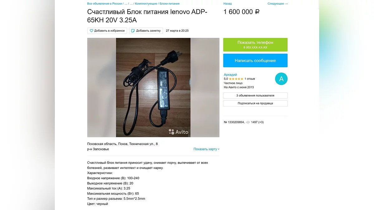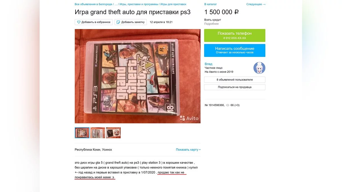 Чего только не встретишь на просторах Авито. Принято считать, что на сайт с объявлениями стоит отправляться, если очень хочешь сэкономить, но порой продавцы просят за свой товар сумму, которая превышает стоимость нового товара буквально в миллионы раз. В этой подборке вы увидите GTA 5 за 1 500 000 рублей, счастливый блок питания, снимающий порчу и еще много крайне интересных предложений.