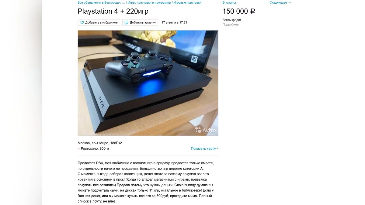 Если предложение прошлого продавца показалось вам настолько привлекательным, что вы купили все его игры невзирая на отсутствие у себя дома PS4, торговцы с Авито не оставят вас в беде. Представляем вашему вниманию PS4 за 150 тысяч рублей.