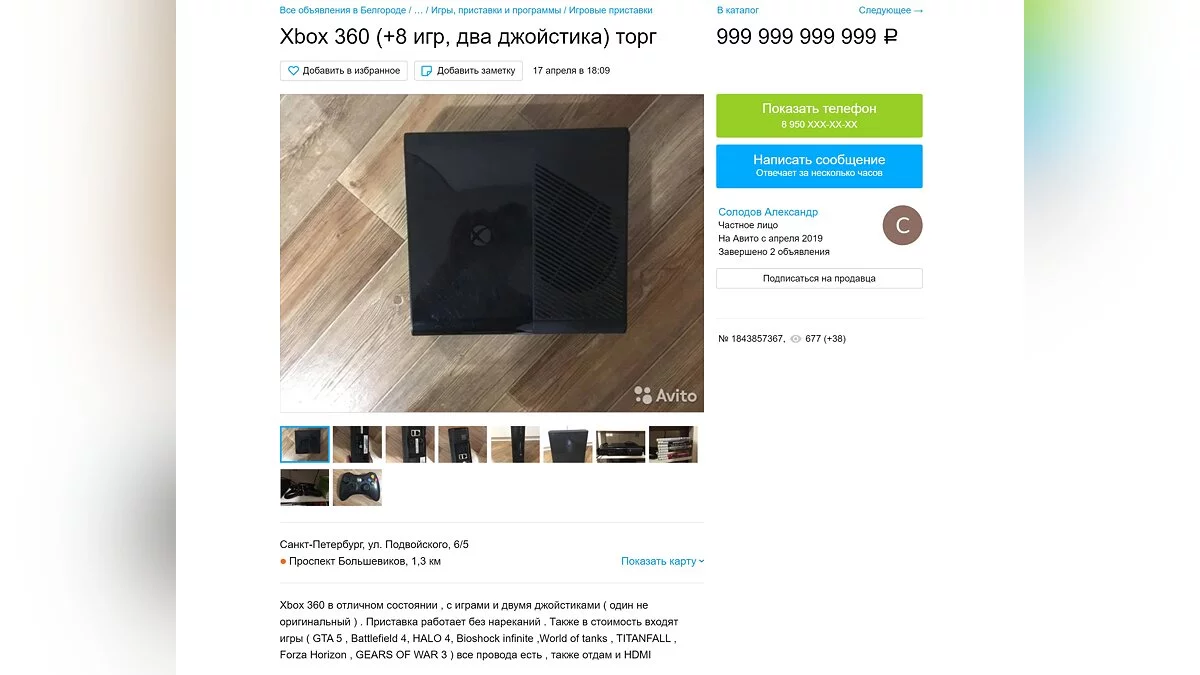 Нет, он не золотой. Нет, корпус не обшит бриллиантами и изумрудами. Да, это самый обычный Xbox 360, но с двумя геймпадами и восемью играми в комплекте. Если вам цена кажется несколько завышенной, то продавец готов поторговаться. Кто знает, может именно вам удастся взять это сокровище на несколько миллиардов дешевле.