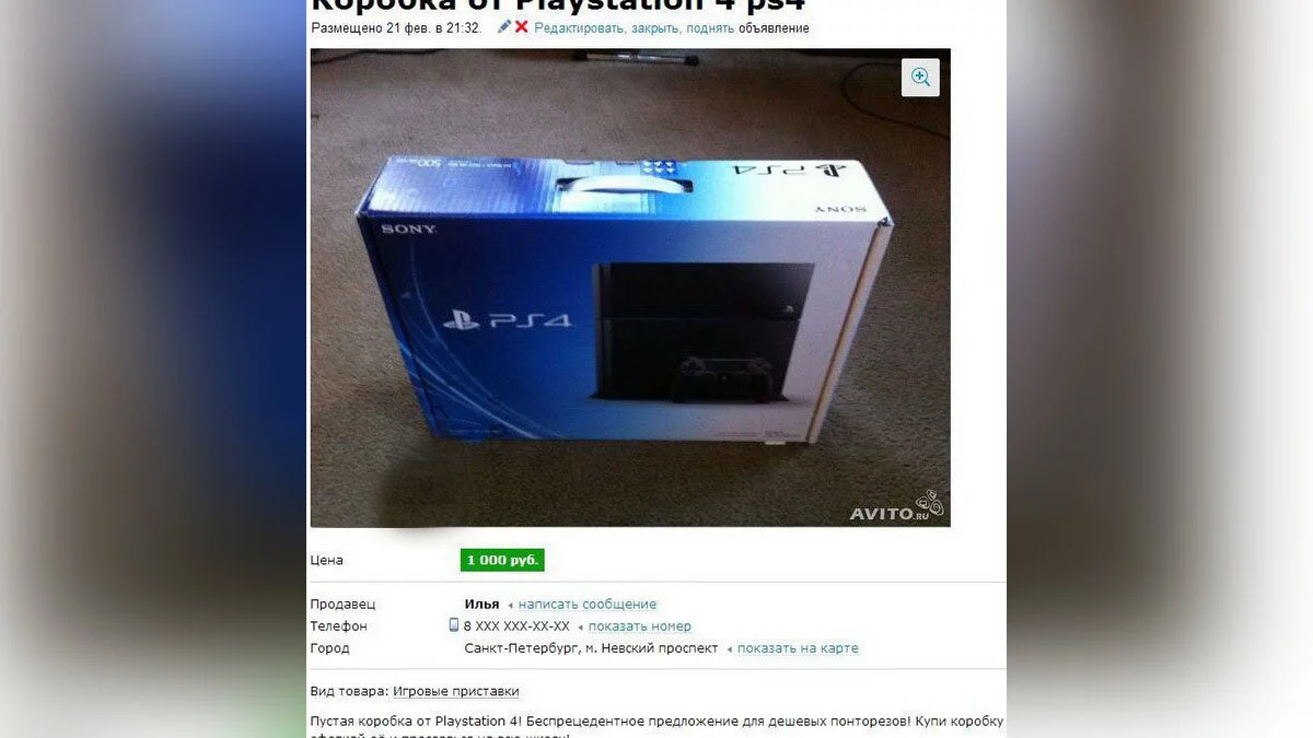 Если не хватает денег на PS4, не переживайте, ведь мир не без добрых людей. Всего за тысячу рублей вы можете приобрести коробку от консоли. Все по заветам Джека Воробья.