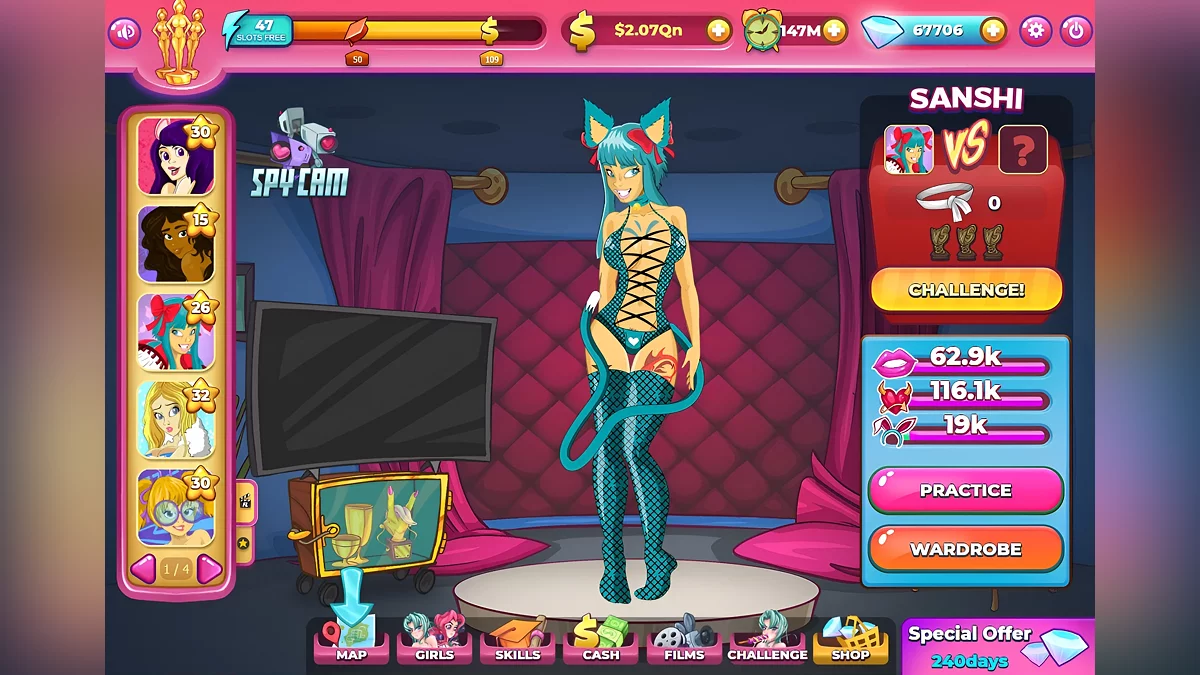 Гораздо интереснее способ заработка — в криокапсулах мы находим красавиц из разных вселенных. Теперь предстоит договориться с ними, развратить, а после запустить трансляции с их участием на целую галактику — от танцев в откровенной одежде до «приключений» в их родных мирах. С доходов «канала» финансируем войско.