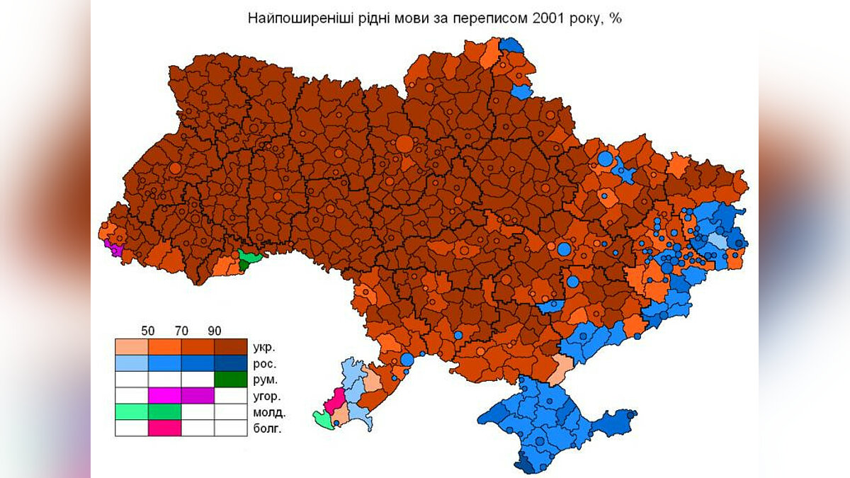 3 в Украине не 90% а 30-40 процентов русскоязычного населения из которых менее 15% считают русский родным языком, на украинском хорошо говорит до 85% населения Украины.