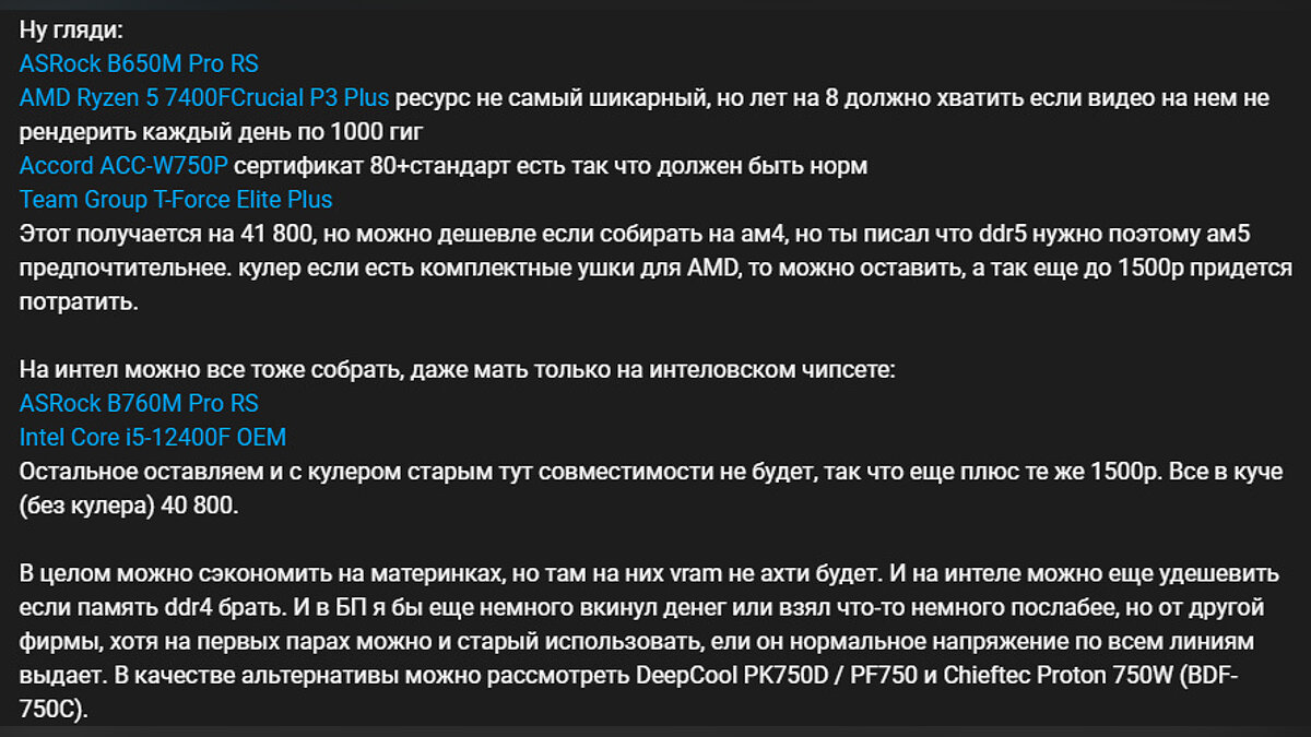 Вот меня @Virtosaurus просил бюджетные комплектующие подобрать.