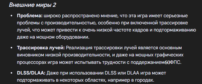 скрин скинул, показал пример проблемы РТ теней. что накосячил с ними. вот там про это и написано. изза этого проблемы с фпс. щас это починят и будет супер. но пока с РТ не играбельно. если ток 4090 или 5070ti+ (есть конечно люди которым 60фпс норм, но я не из таких я играю на пк в 2025 году и хочу плавную картинку с высоким фпс) тем более есть сравнение с другими топ проектами с более крутой картинкой и фпс в 2-3 раза выше. от этого отталкиваюсь