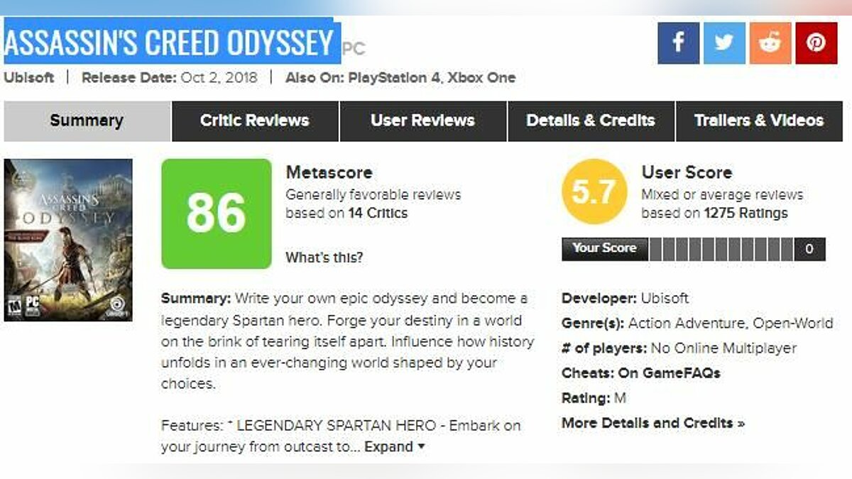 Забейте на этот метакритик, это песочница для хейтеров. Единственная площадка которая отображает РЕАЛЬНОЕ мнение людей это только стим. Потому что там оставляют обзоры люди которые КУПИЛИ ИГРУ, то есть не каждый мамкин школьник может поставить 0/10, потому что ему надо сначала собрать свои накопленные на обеды деньги и потратить их что бы написать обзор, а такое не каждый может. Есть например игра называется ASSASSIN'S CREED ODYSSEY мне она понравилась, по статистике ее многие ждали, она объединила множество хороших (и даже классических) механик и завернула это все в открытый мир с наикрасивейшей графикой, в стиме 85% людей которые эту купили ее одобрили (См ниже на картинку, прошу обратить внимание на июль там соотношение обзоров просто сумасшедшее). Но на метакритике это полнейший пи***, не понимаю зачем давать возможность писать обзоры тем кто даже игру не покупал, бесят эти болванчики на подобии "Не играл но осуждаю".