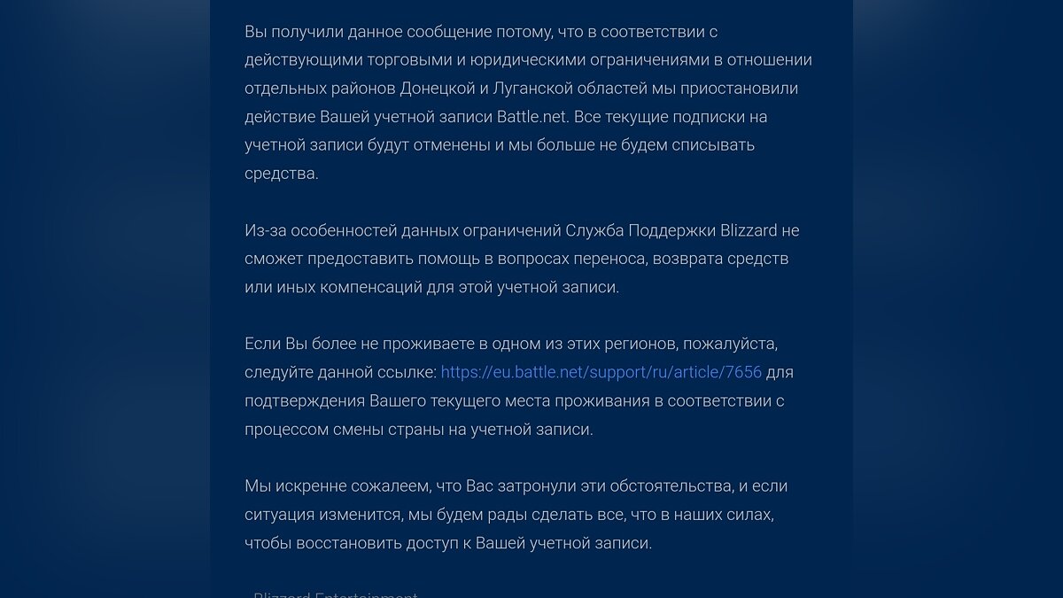 Blizzard начала блокировать аккаунты Battle.net игроков из ДНР и ЛНР