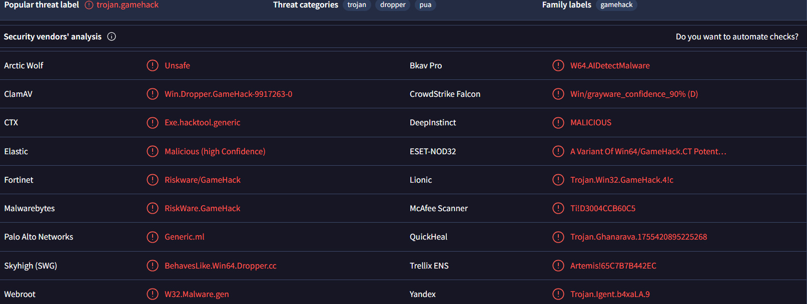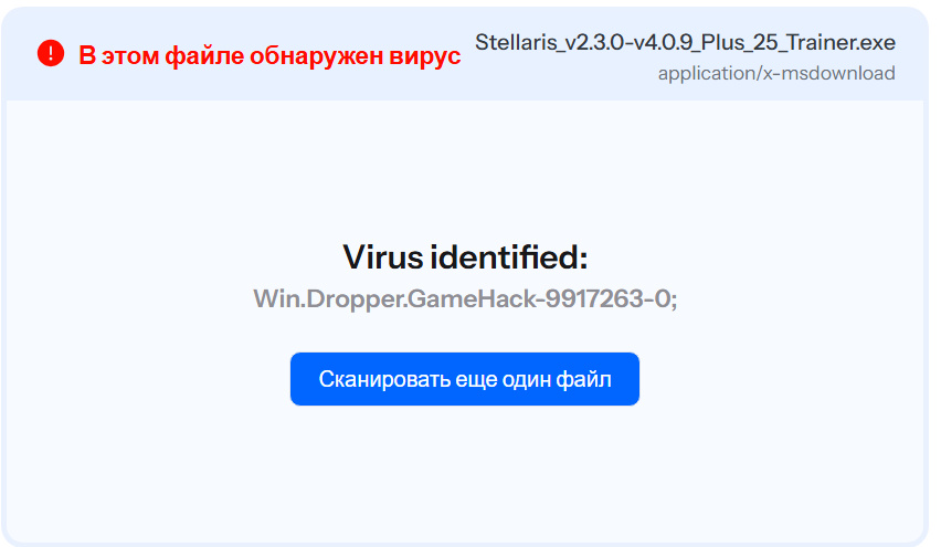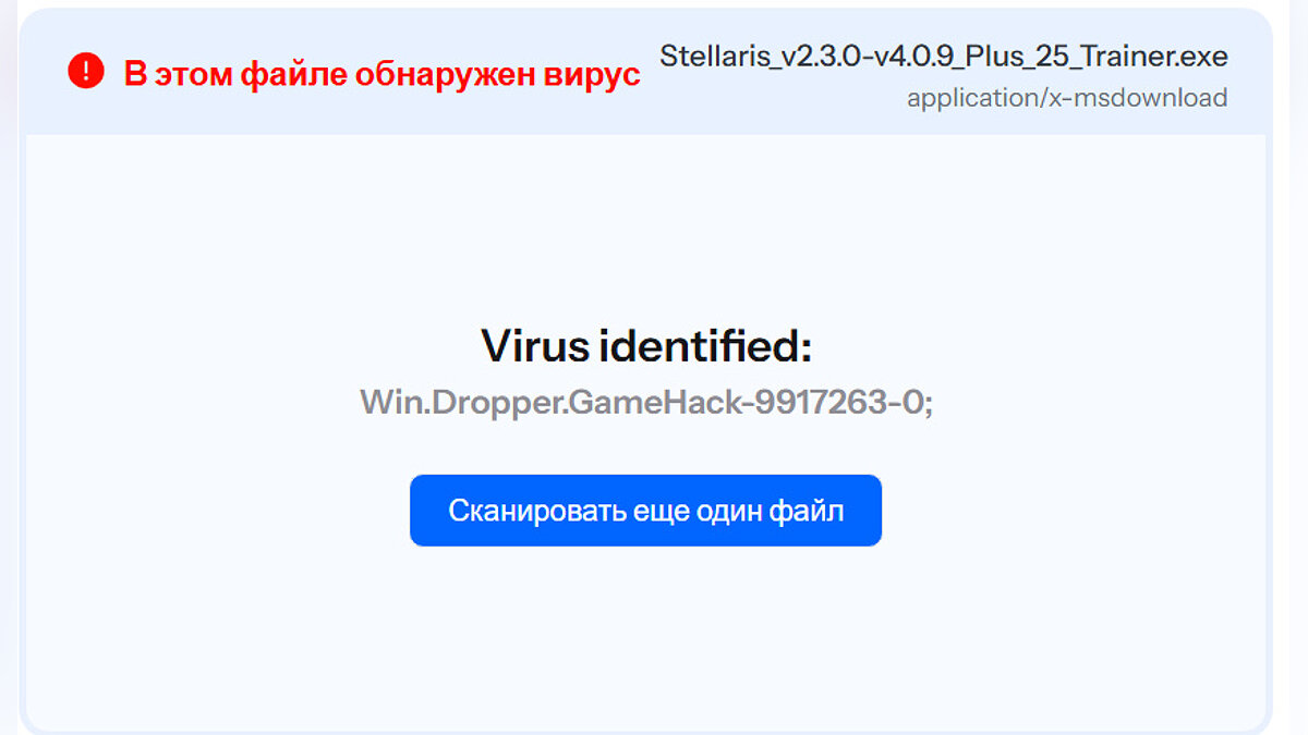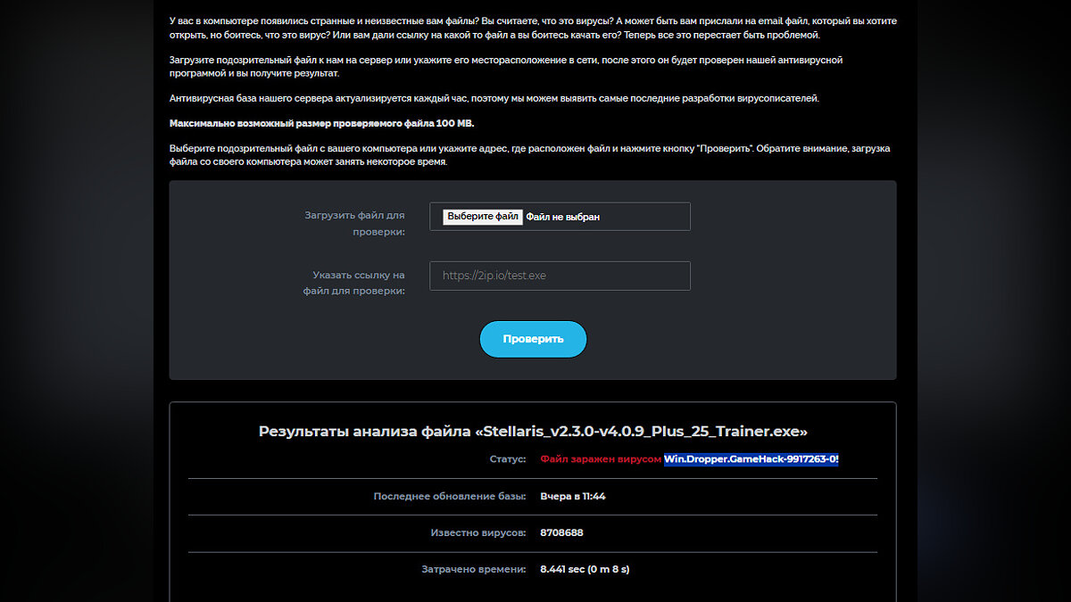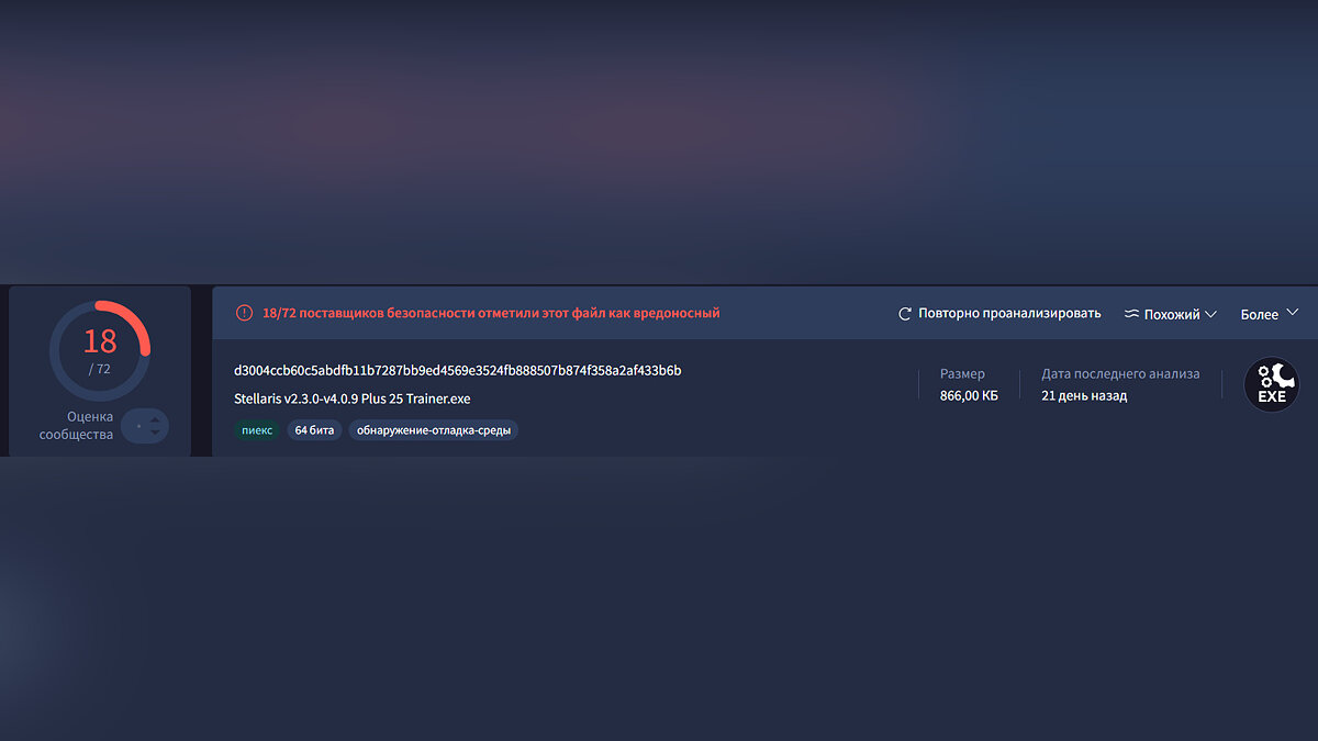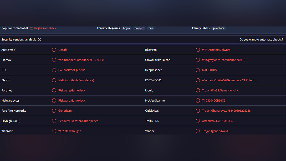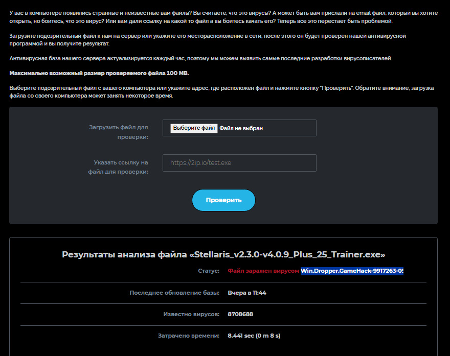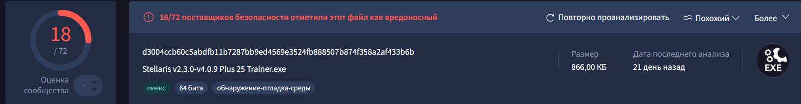 Проще говоря данный файл (который мы РАЗАРХИВИРОВАЛИ НА КОМП, а не проверяем заархивированным) крайне подозрительный! Вполне вероятно, что приведённый выше отчёт о безопасности производился с заархивированным файлом, что даёт тот результат, что и в отчёте, но если разархивировать файл и произвести проверку, то мы видим, что многие КРУПНЫЕ ПОСТАВЩИКИ УСЛУГ БЕЗОПАСТНОСТИ ОТМЕЧАЮТ ЭТОТ ФАЙЛ КАК ОПАСНЫЙ! В общем пользуйтесь на свой страх и риск!