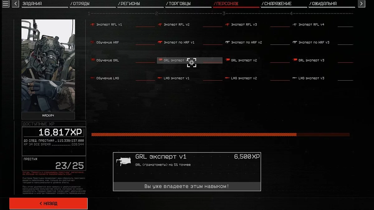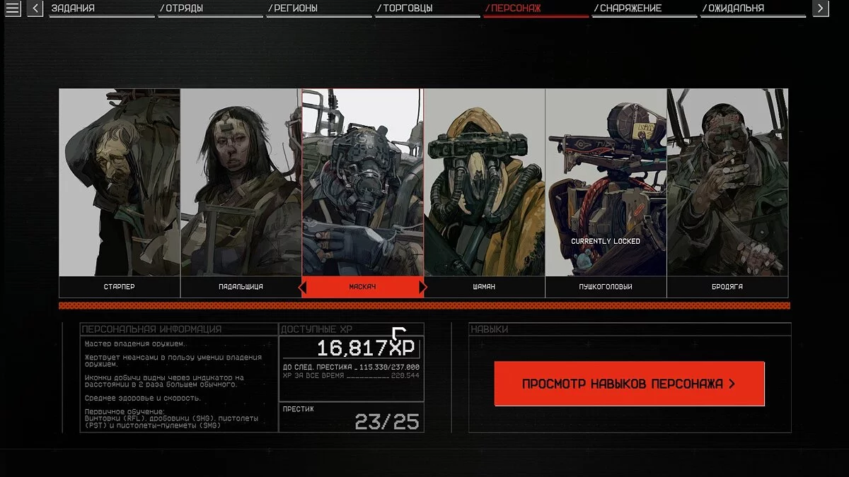 За выполнение квестов и успешные вылазки начисляется опыт, который можно потратить на прокачку персонажа. На выбор несколько героев с определенным набором перков. Например, девушка может быстрее всех перемещаться по локации, но при этом не способна таскать большие рюкзаки и пользоваться крупнокалиберными пушками. А чернокожий здоровяк может без прокачки умений экипировать весь доступный арсенал и носить самые большие контейнеры, но при этом застревает в проходах из-за высокого роста, а ещё бегает хуже всех. В определенный момент выпадет шанс обновить престиж своего героя. В таком случае вы потеряете все приобретенные навыки, но взамен получите повышенные характеристики, включая здоровье и возможность таскать больше лута.