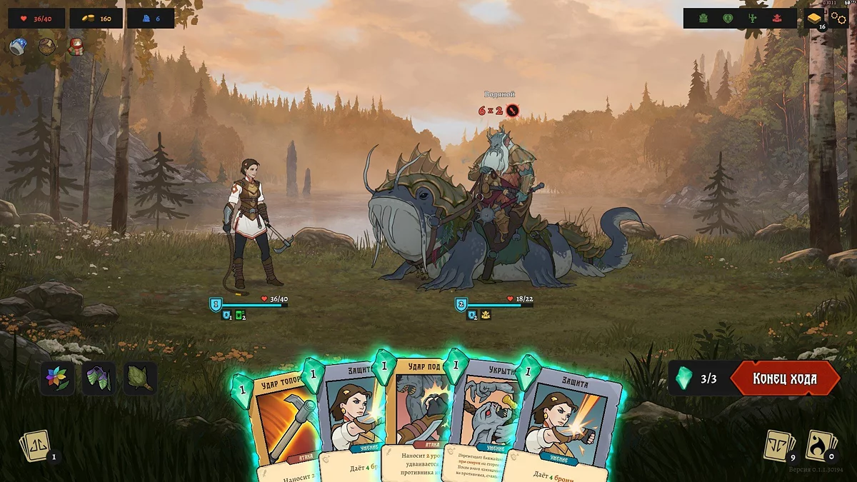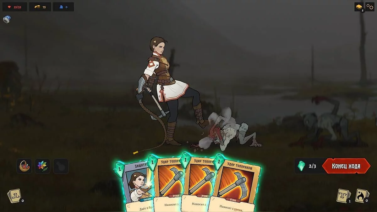 Сражения пошаговые и происходят с помощью колоды карт. Сначала ваши возможности ограничены, но чем дальше продвинитесь, тем богаче будет «библиотека». За ход у каждого персонажа есть три действия, однако надо учитывать, что некоторые карты тратят по два, а то и все три очка.