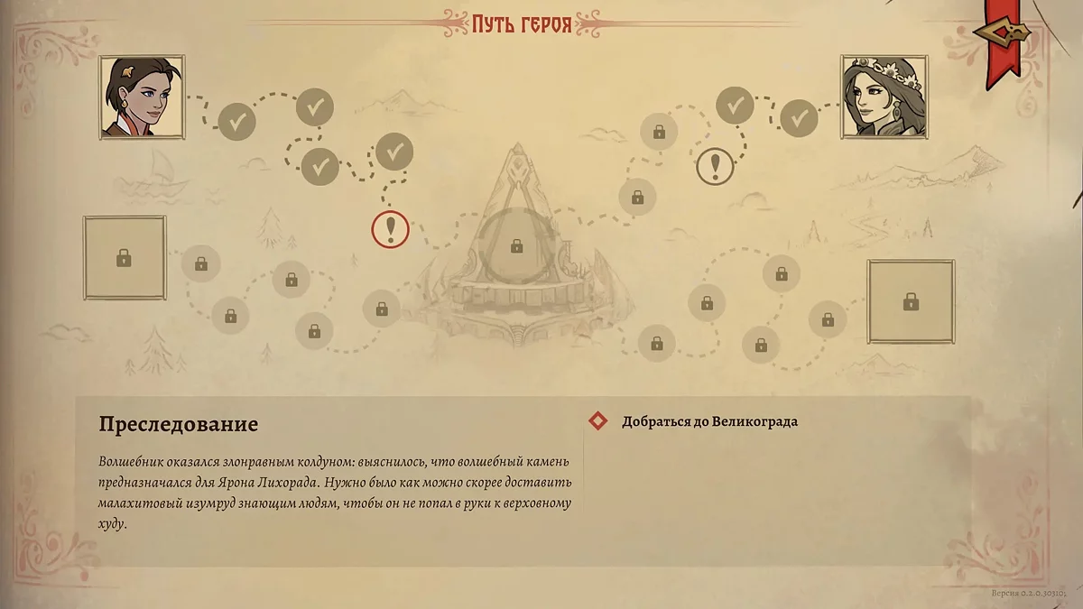 Всего доступно 4 персонажа — Добрыня Никитич, Алёша Попович, Василиса Премудрая и Варвара-Краса. У каждого из них есть собственная ветка истории, которая состоит из нескольких квестов. Однако каждый этап включает внушительное количество «комнат». Разработчики заявили, что для полного понимания происходящих событий очень желательно пройти игру все 4 раза, что автоматически делает геймплейное время весьма продолжительным. По итогу все протагонисты должны встретиться в одной точке, видимо, для выполнения финального квеста.