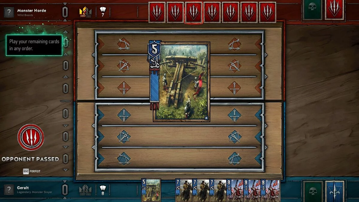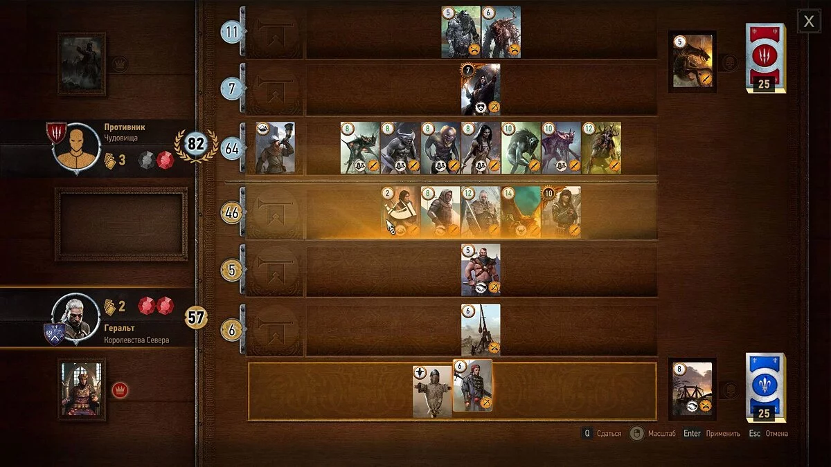 Победа по результатам раунда присваивается тому игроку, чьи выложенные карты оказались в сумме самыми сильными. Есть специальные карты, действие которых может затрагивать один из трех рядов — сила выложенных карт возрастает вдвое или, наоборот, снижается до 1. Всего есть пять видов колод, определяющих набор карт — чудовища, королевства Севера, Скоя'таэли, Нильфгаард, в дополнениях также добавили Скеллиге.