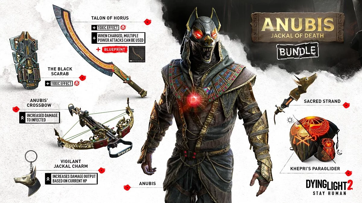 В состав DLC входят костюм египетского бога Анубиса, мистический хопеш Коготь Гора, арбалет Анубиса, который наносит увеличенный урон заражённым, светящийся ночью параплан Хепри, оберег Шакала (увеличивает наносимый урон в зависимости от текущего значения HP), крюк, который в прошлом использовался для возведения статуй, а также щит Черный скарабей.