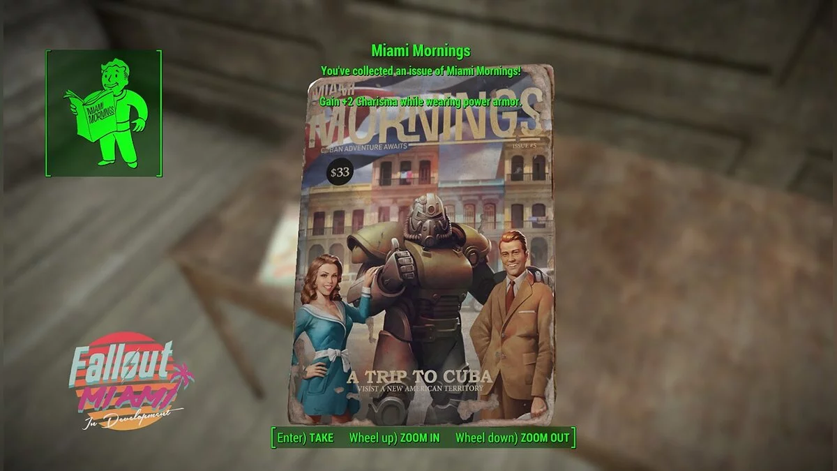 Также будут добавлены новые предметы, оружие, силовая броня и квесты. Что касается общего глобального квеста, то пока что заявлено, что игрок отправится из Содружества в путешествие по пост-ядерной пустоши Майами и станет участником местного конфликта между людьми, желающими личной свободы и стремящимися навести общий порядок в регионе.