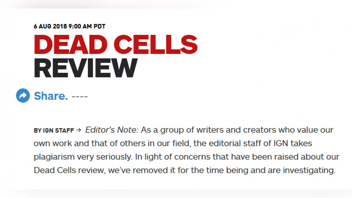 Если сейчас перейти по ссылке на обзор от IGN, то можно увидеть следующее примечание редактора: «Как группа писателей и создателей, которые ценят собственную работу и работу наших коллег, редакция IGN очень серьезно относится к плагиату. В свете проблем, которые были затронуты в обзоре на Dead Cells, мы удалили его и занимаемся расследованием».