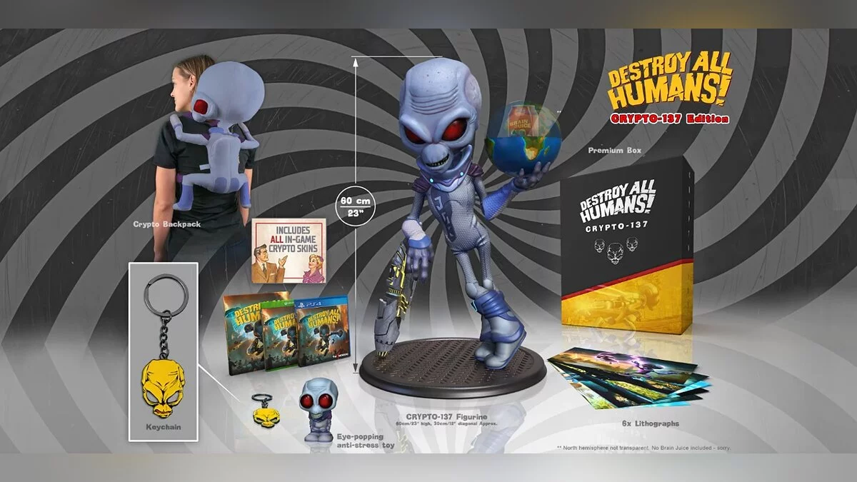 THQ Nordic показала коллекционные издания ремейка Destroy All Humans!, одно из которых содержит рюкзак в виде пришельца на спине.