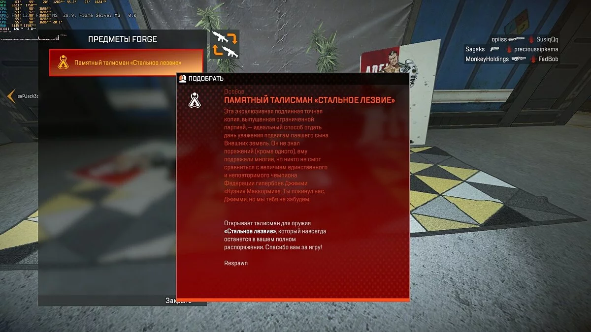 После этого на странице четвертого сезона изображение Кузни стало затемненным, а снизу появилось описание, что герой «пал». Гибель так и не появившегося персонажа в Apex Legends разработчики обыграли специальным контейнером с посланием на «Сортировочной фабрике», где проходило интервью. Из ящика можно получить талисман «Стальное лезвие».
