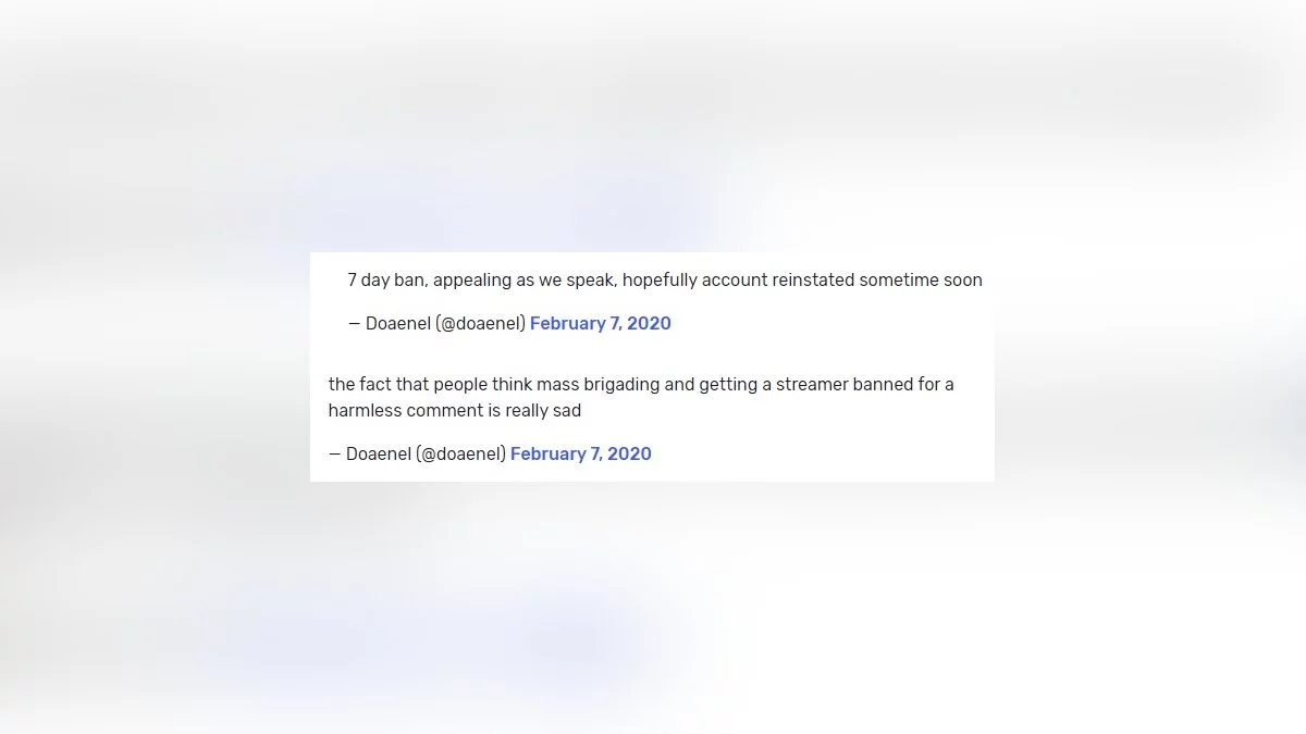 Сама Yvonnie отметила, что это действительно домогательство, а не просто обычный вопрос. Канал doaenel после этого был заблокирован Twitch. Стример же сообщил в твиттере, что блокировка продлится 7 дней, а также добавил, что неправильно массово нападать на человека за «безобидный вопрос». После этого doaenel закрыл Twitter-аккаунт.