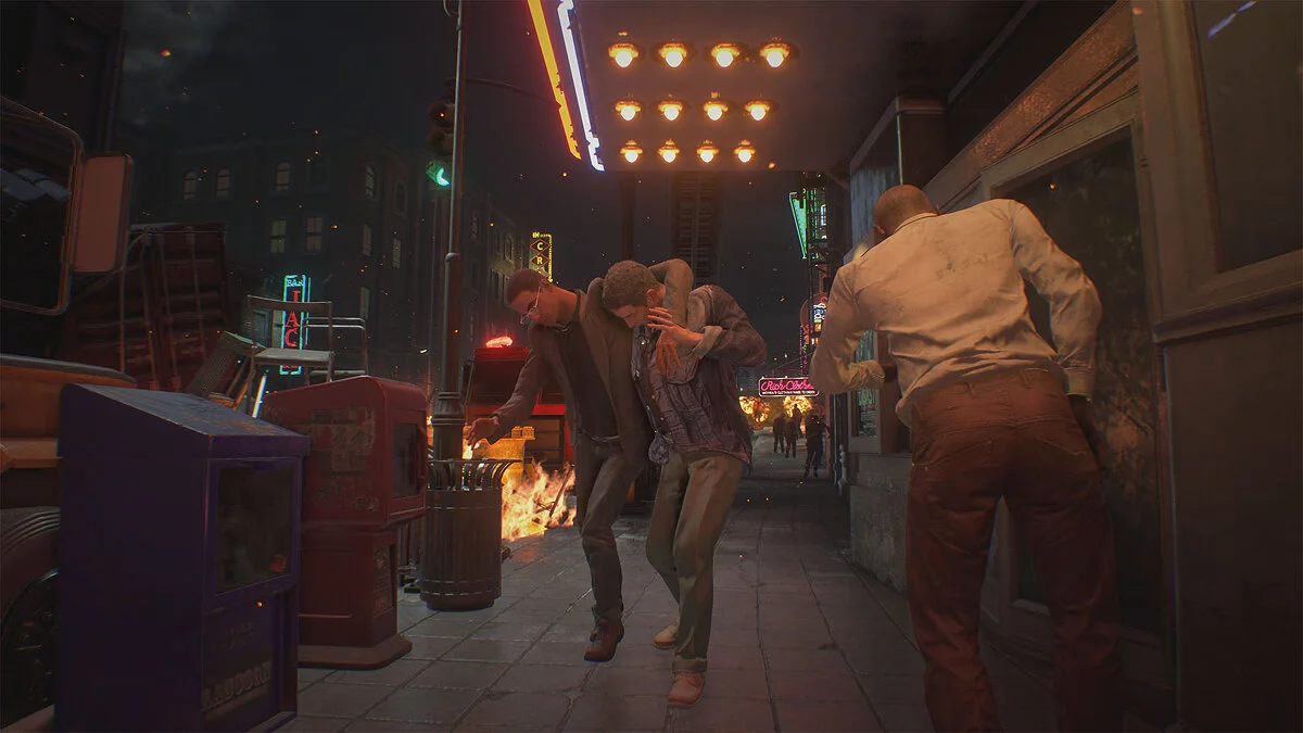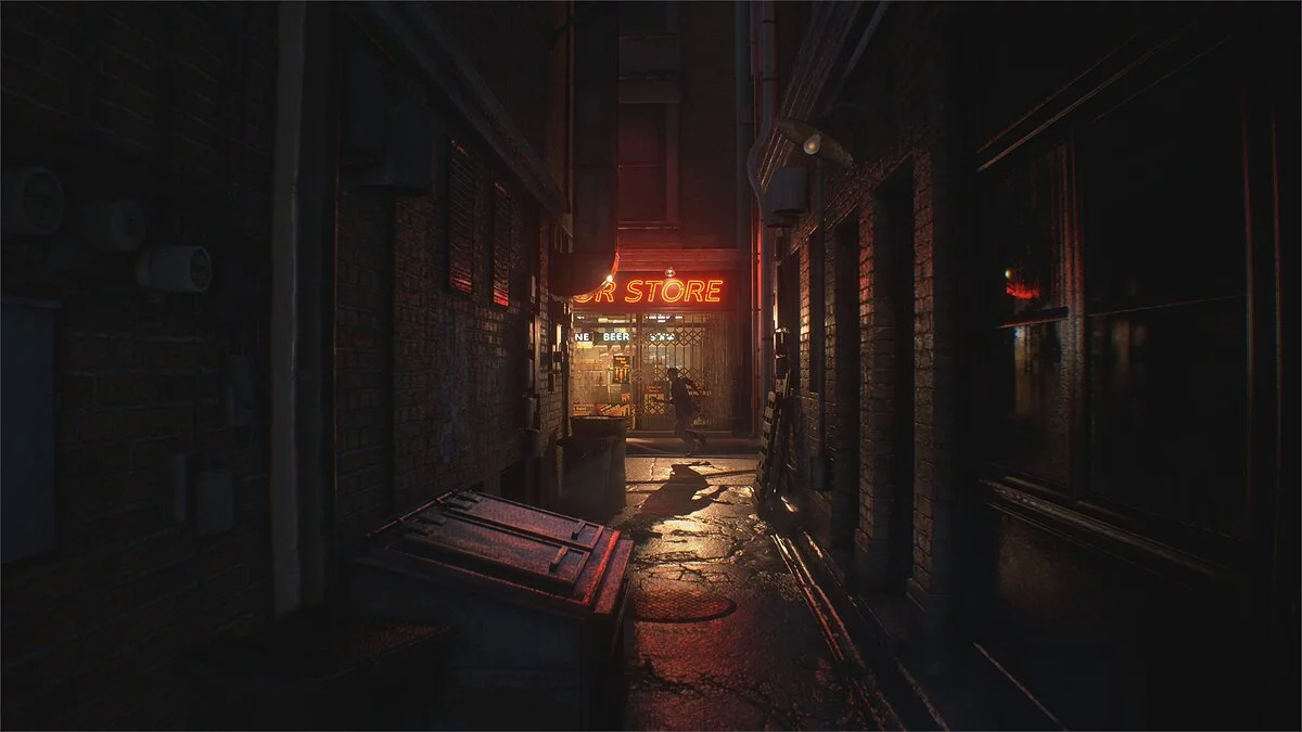 На первом скриншоте мы наблюдаем из темной аллеи, как прохожий спасается бегством. Разработчики спрашивают, «готовы ли мы к темным улицам и внезапным поворотам Раккун-Сити».