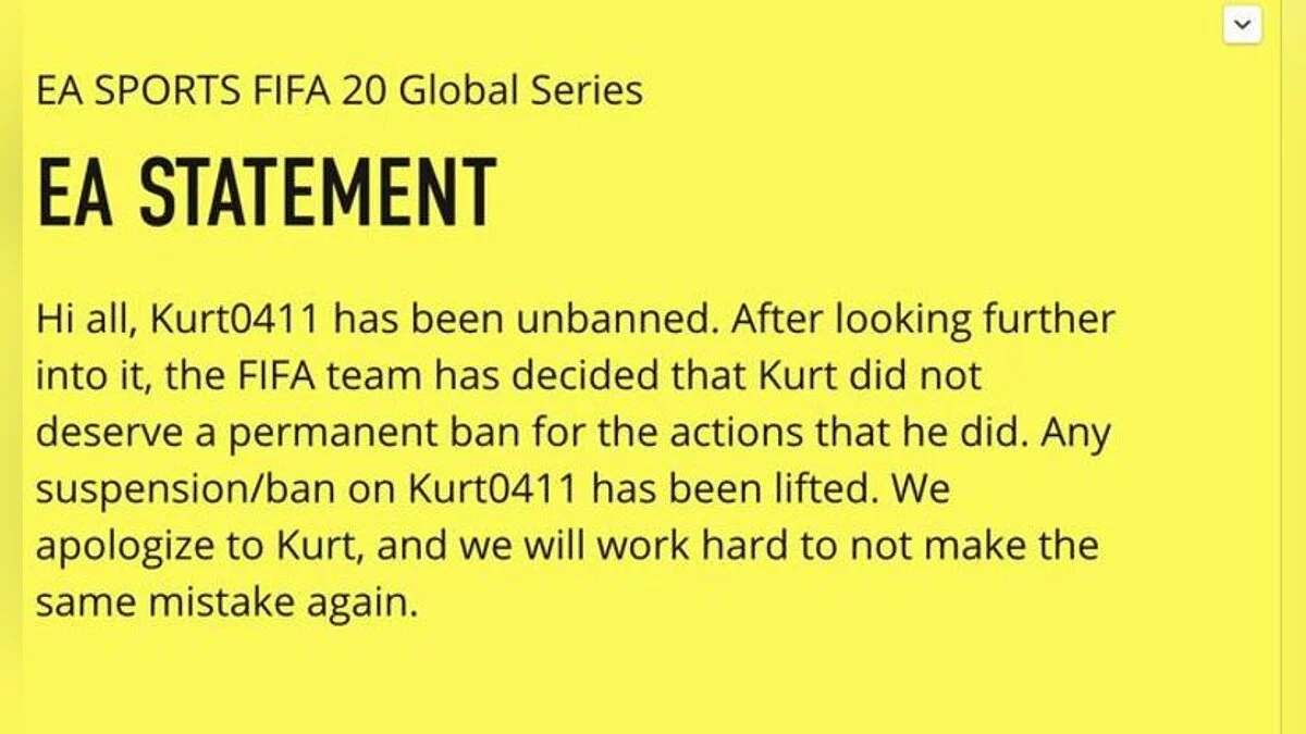 Теперь же в официальном аккаунте Electronic Arts выступила с объемным заявлением, в котором говорится о полном бане Kurt0411 в любых играх компании.