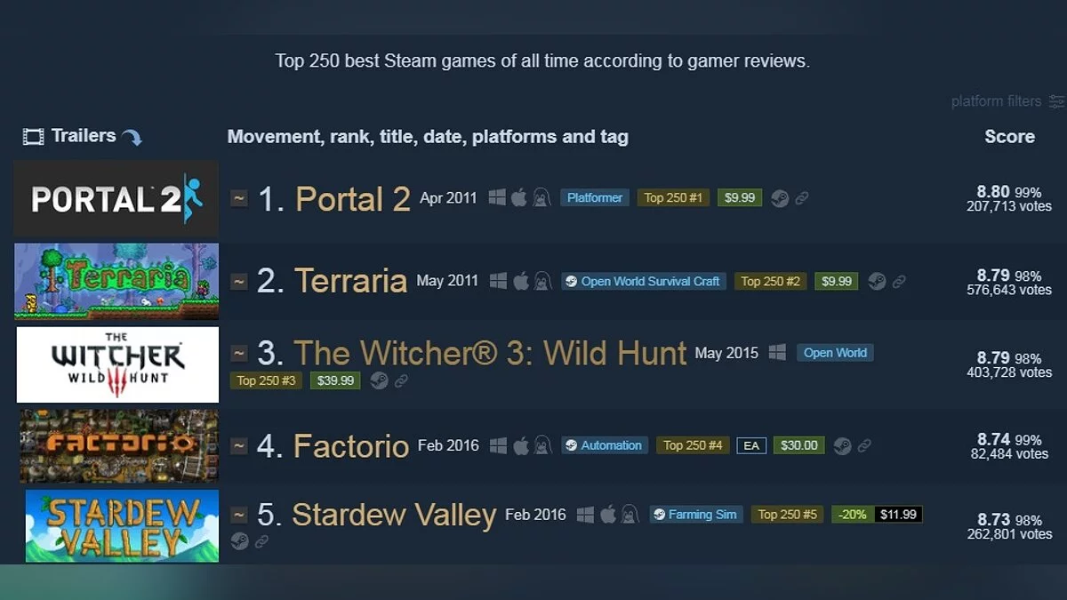 И хотя Factorio не так популярна, игра получила от геймеров одни из самых высоких оценок в Steam. Сейчас проект располагается на 4 месте среди всех тайтлов площадки. По данным Steam Top 250, выше нее по рейтингу только Portal 2, Terraria и The Witcher 3. Игроки оставили Factorio 98,7% положительных отзывов.