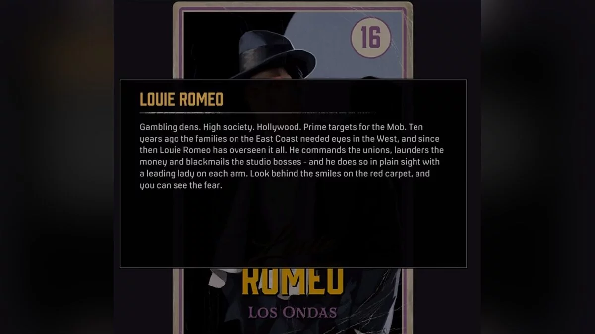 Другой намек на персонажей возможной Mafia 4 есть в карточке с неким Луи Ромео из города Лос-Ондас, который тоже впервые упоминается в рамках франшизы. Вероятнее всего, что Ромео является одним из боссов местного аналога Лас-Вегаса.