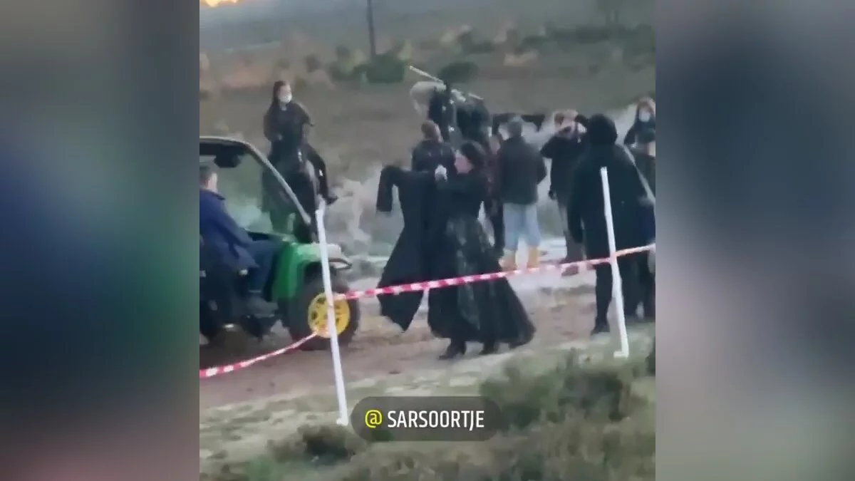 На другом видео Генри Кавилл спускается с лошади. Также можно увидеть Аню Чалотру и ее каскадершу в новых платьях.