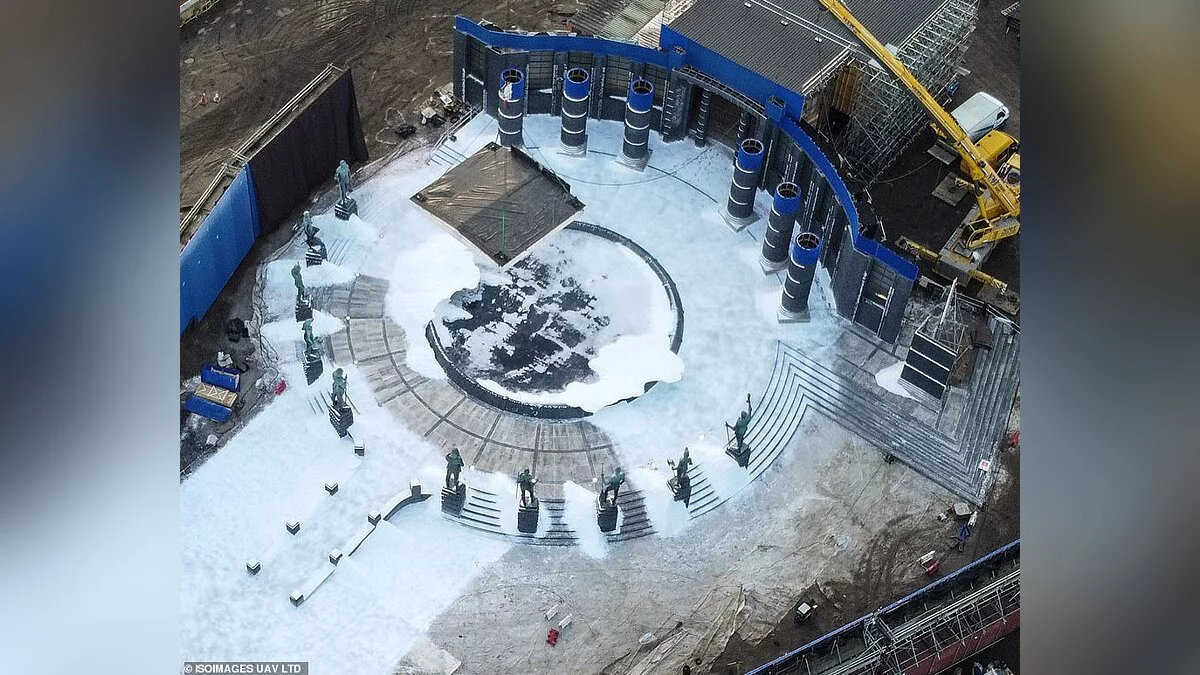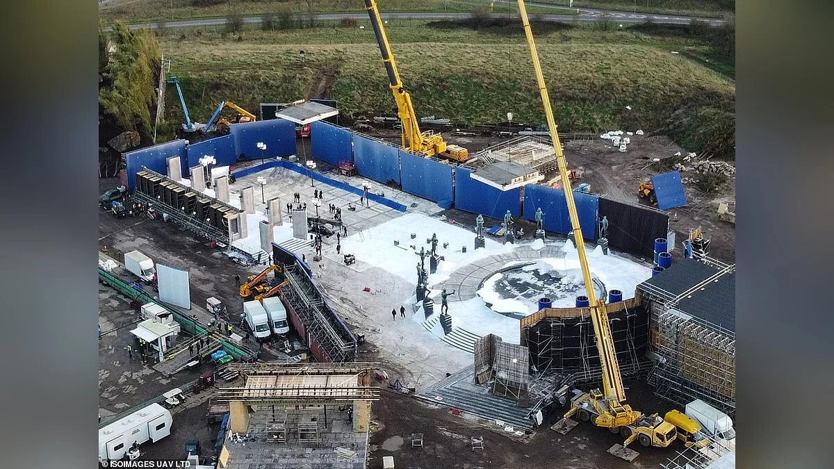 На других же фото можно увидеть, что в Готэме в новом Бэтмене не только льет проливной дождь, который красочно показан в тизере, но и идет снег. На этой серии снимков изображено некоторое сооружение со статуями, расположенными в кругу. Вероятнее всего, у Пингвина должна быть сцена в таком красочном месте.