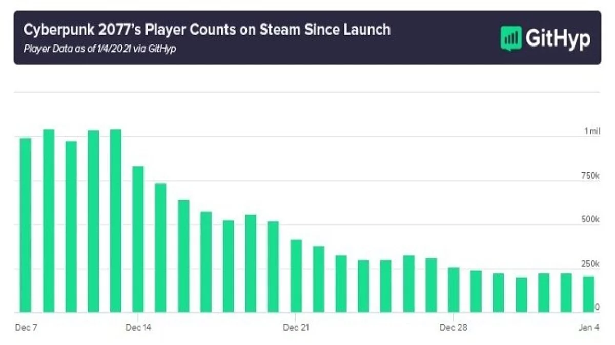 Это могло повлиять на то, что на ПК в Steam Cyberpunk 2077 рекордно обрушилась на 80% активных игроков за месяц. Через одну неделю после релиза падение составило 50% игроков. Сейчас в Cyberpunk 2077 играют 225 тыс. человек.