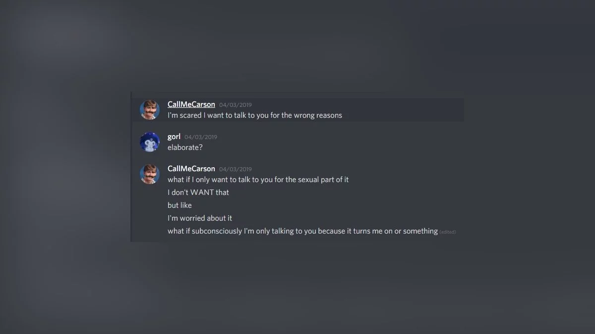 В выложенных скриншотах и роликах в твиттере девушки можно увидеть, что CallMeCarson осознает, что поступает неправильно, но его это также заводит. Девушка же тоже в определенный момент отмечает, что так продолжаться не может. Сама же переписка полна сообщений сексуально подтекста.