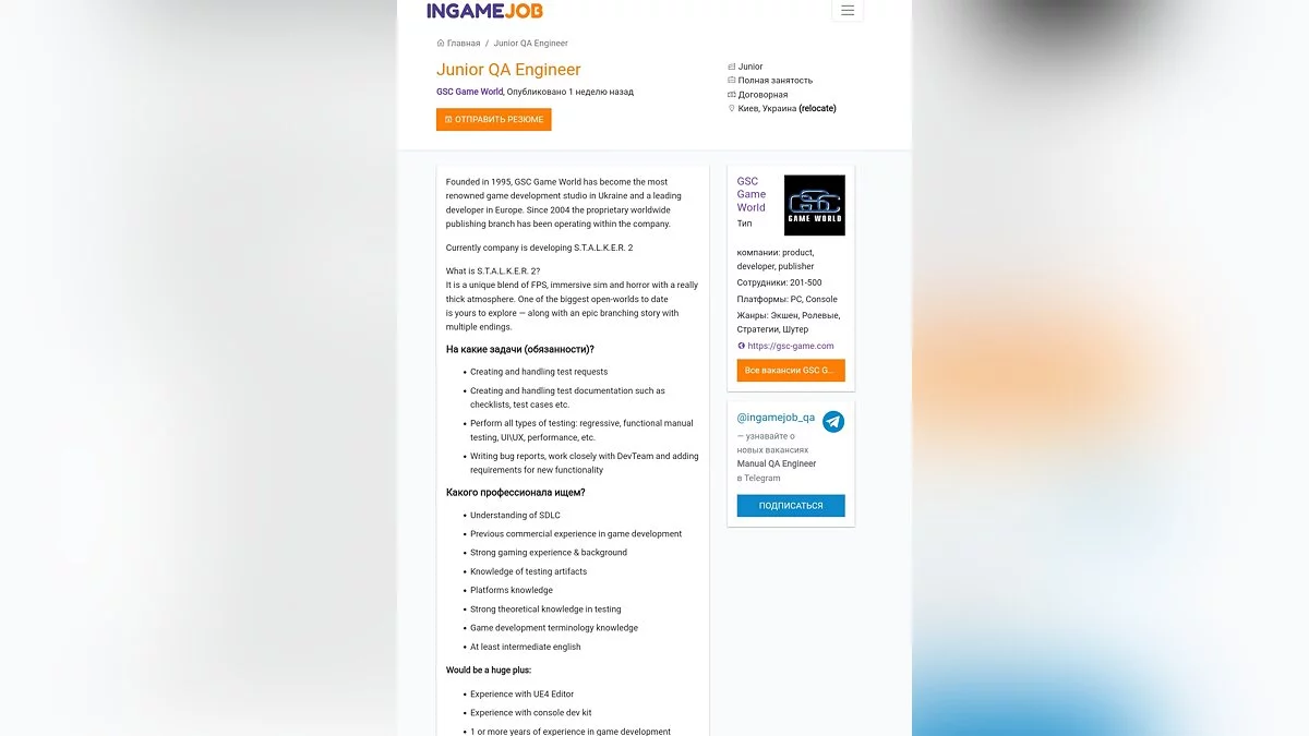 Отмечается, что работа неудалённая, поэтому в первую очередь рассматриваются кандидаты из Украины. Соискатели из других стран должны будут готовы переехать на постоянную работу.