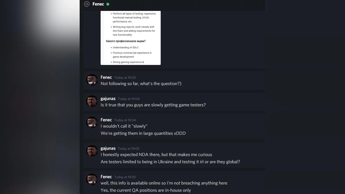 За комментариями пользователи официального Discord-канала обратились к комьюнити-менеджеру GSC под псевдонимом Fenec. Он подтвердил вакансию, а также отметил, что поиск идет не «в замедленном режиме», а кандидатов рассматривают «большими партиями».