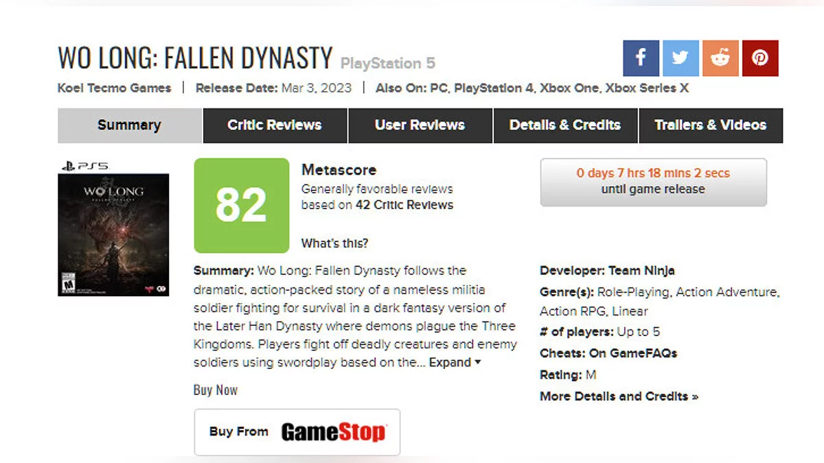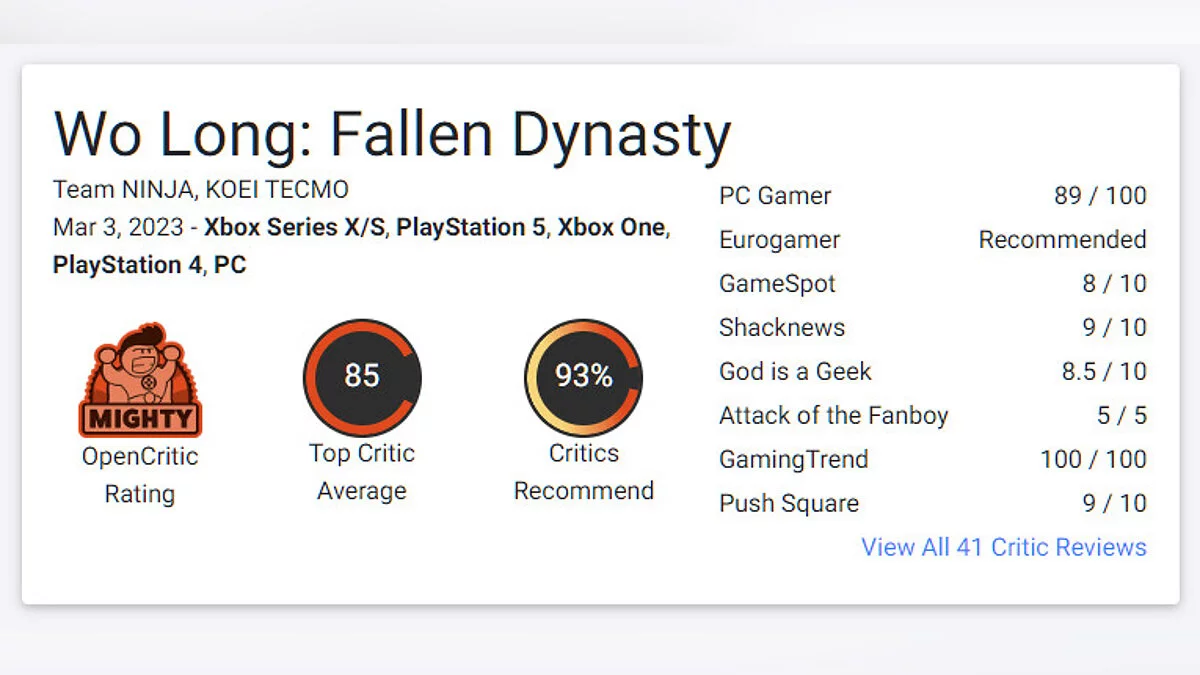 В сети появились обзоры на экшен Wo Long: Fallen Dynasty от создателей серии Nioh. На Metacritic у игры 82 балла, на OpenCritic — 85 баллов и 93% рекомендаций к покупке.