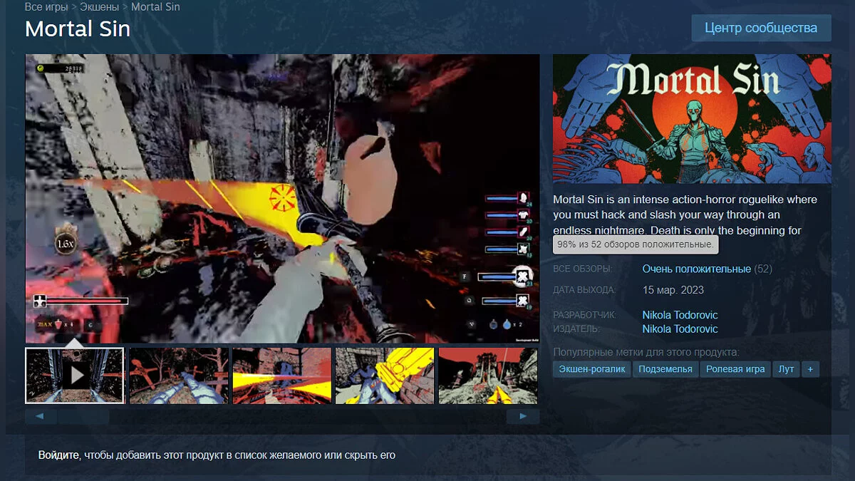Независимый разработчик Никола Тодорович (Nikola Todorovic) выпустил в раннем доступе Steam мрачный экшен от первого лица под названием Mortal Sin, который в первый день получил очень положительные отзывы от геймеров.