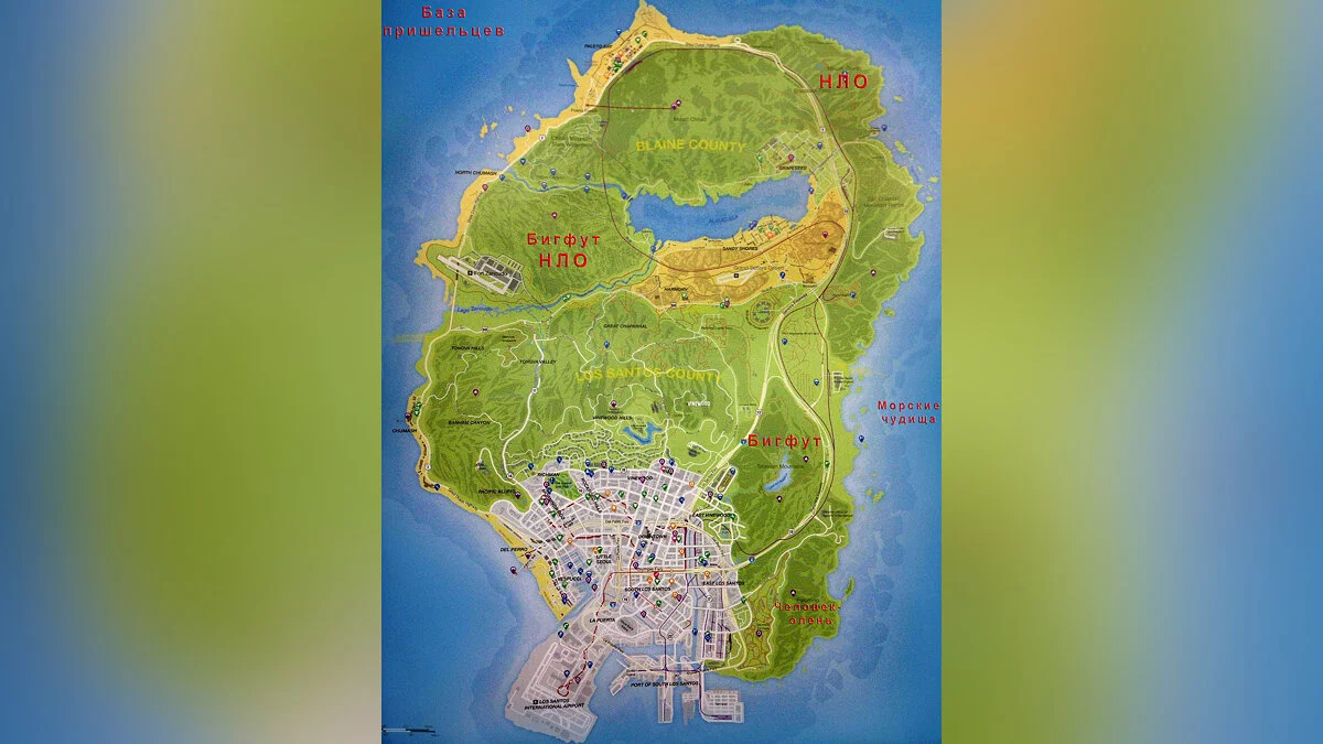 Однако НЛО и Бигфут — не единственные диковинки, которые можно найти в GTA 5. В игре вы также сможете отыскать базу пришельцев, морских чудищ и охотника на оленей (Человека-оленя). Обратите внимание на карту ниже: